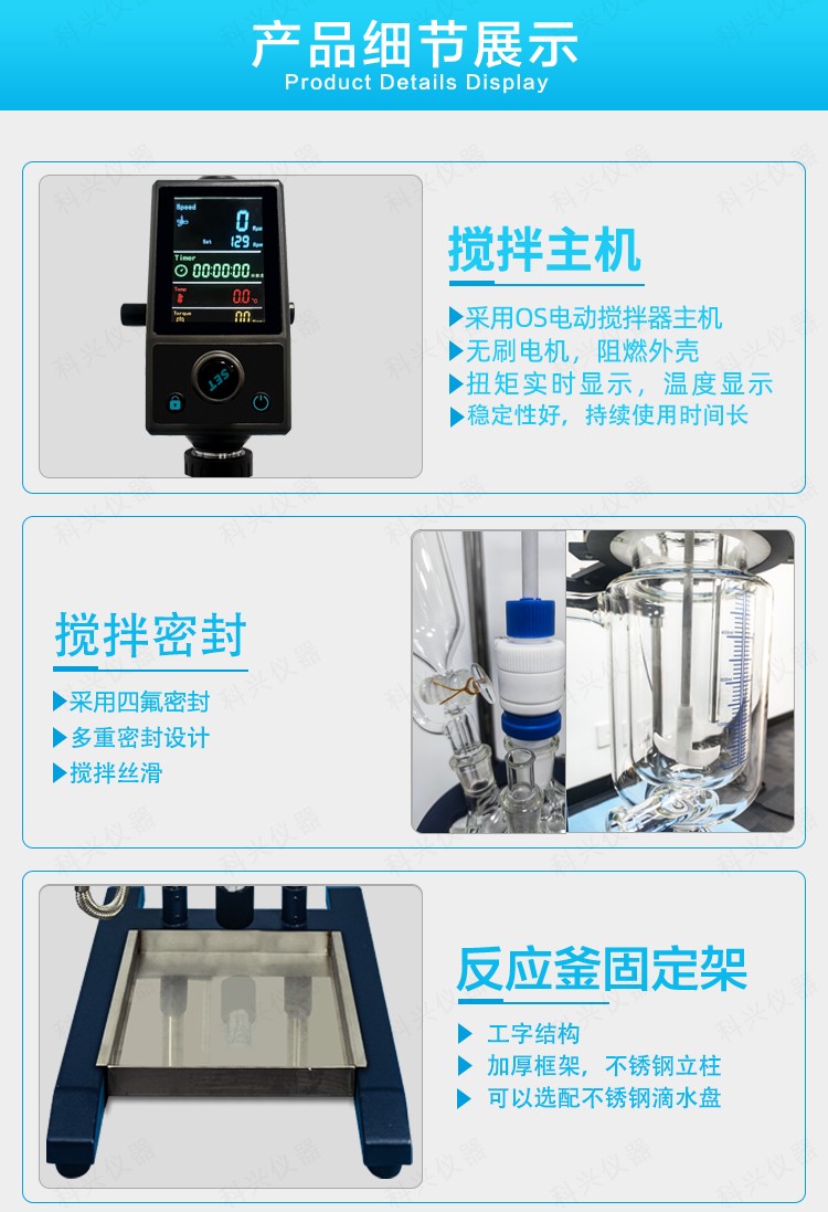 公司又根據客戶具體使用環境做出1-5L小型玻璃反應釜升級款,采用我司OS-Pro系列攪拌器主機作為核心主機,一體大屏顯示轉速,定時,溫度和實時的電機扭矩。